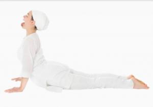 5. Примите позу Кобры, лягте на живот, ладони под плечами. Со вдохом поднимитесь на руках, расправив грудь (можно принять промежуточную позу кобры – подняться на предплечьях). Вы не должны ощущать боль в пояснице.