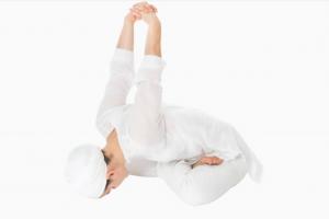 Переплетите пальцы рук за спиной и наклонитесь вперёд и вниз, коснитесь лбом пола. Поднимите руки вверх.