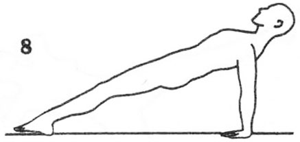 8. Обратная платформа. Сядьте прямо, ноги вытянуты вперед. Положите ладони на пол за спиной пальцами к себе на ширине плеч. Выпрямите руки, одновременно поднимая таз и подтягивая живот, так чтобы тело от затылка до пяток образовало прямую линию. Смотрите прямо перед собой. Не сгибая коленей, начните «ходить» на пятках и на руках. Продолжайте 3 минуты.