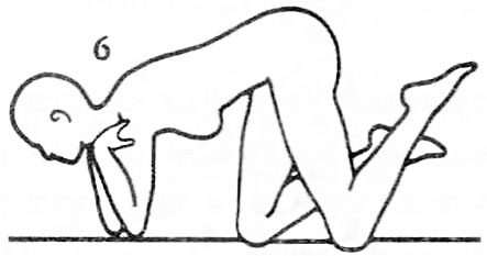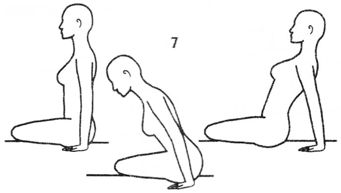 6. Ходьба на локтях и коленях. Лягте на живот. Затем встаньте на колени и локти. Пятки приближены к ягодицам. Локти согнуты, ладони касаются плеч; лицо смотрит перед собой, взгляд направлен вперед. Начинайте ходить и ходите в таком положении 3 минуты. Затем лягте на спину и полностью расслабьтесь. 1 минута.