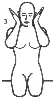 3. Массаж ушей. По-прежнему сидя на пятках, приблизьте ладони к ушам; пальцы соединены. Начните массировать ладонями раковины и мочки ушей. Чередуйте круговые движения с прямолинейными, направленными вверх-вниз. Продолжайте 2-3 минуты. Затем на вдохе осторожно потяните мочки ушей вниз и в стороны. Задержитесь в этой позиции на 10 секунд. Выдохните и расслабьтесь.