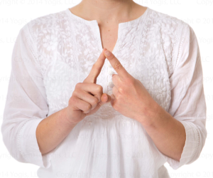 МУДРА: Положите подушечку правого указательного пальца (пальца Юпитера) на подушечку левого указательного пальца, правую ладонь отверните от себя, левую ладонь поверните к себе, образуя угол между пальцами в 45 градусов. Указательные пальцы направлены вверх.